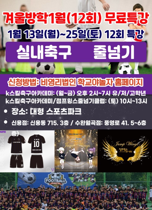 겨울방학 1월 2주간(12회) 무료특강 신청(축구, 줄넘기)_ 신용점, 수완월곡점