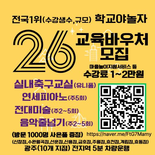 2026년 교육바우처 접수(11월1일(토)부터~ 접수) 페이지 정보 작성자 관리자 작성일25-10-27 11:40 조회381회 댓글0건 다음글 목록 본문 26년 교육바우처 신청하기1. 신청서류 작성: 25년 11월1일(토)~ 신청서류 작성2. 신청방법(네이버폼 신청) 1) https://naver.me/FtG7Mamy 2) QR코드 신청하기 다음글 목록